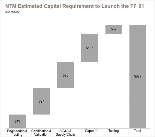 根据交易方案,PSAC目前以信托形式持有的2.3亿美元现金,而来自美国、欧洲和中国的超过30家长期机构股东将以每股10.00美元的价格超额认购7.75亿美元完全承诺的普通股PIPE,10亿美元的资金已经足够支持FF91的大规模量产和交付。FF商业计划书显示,FF91股票融资后的12个月预计资金需求约为3.77亿美元。