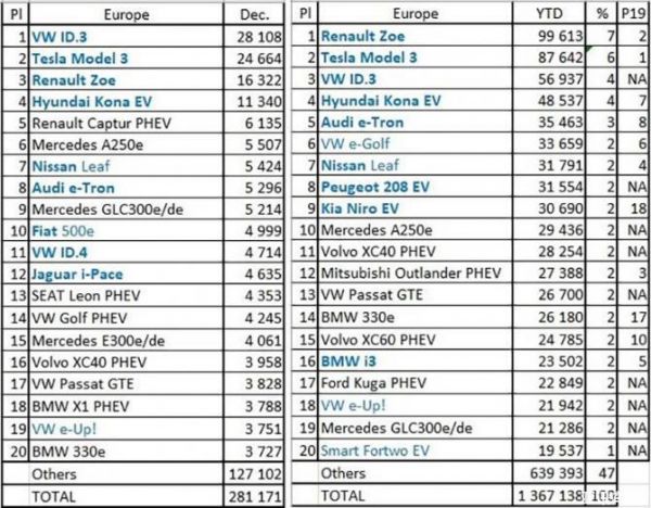 EV Sales Blog数据显示,2020年欧洲新能源乘用车销量超过136万辆,成功超越中国(124.6万辆)成为全球新能源销售冠军。其中,欧洲老牌畅销纯电动车雷诺ZOE以99613辆的销量位居第一,特斯拉Model 3(87642辆)只能屈居第二。