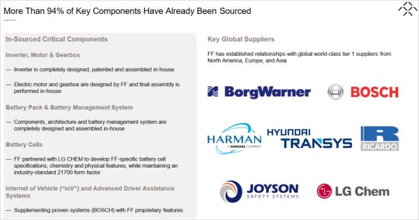 截至目前,FF91已经完成了大部分的车辆开发任务,超过94%的零部件供应商已经确定,包括博格华纳、博世、LG化学、现代、均胜电子等。