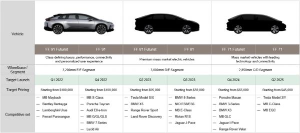 其中,FF81定位于高端大众市场电动汽车,售价5.9万美元(40万人民币)起,对标特斯拉Model S/X、宝马系产品;FF71对标特斯拉Model 3/Y、奔驰C级,售价4.5万美元(30万人民币)起。