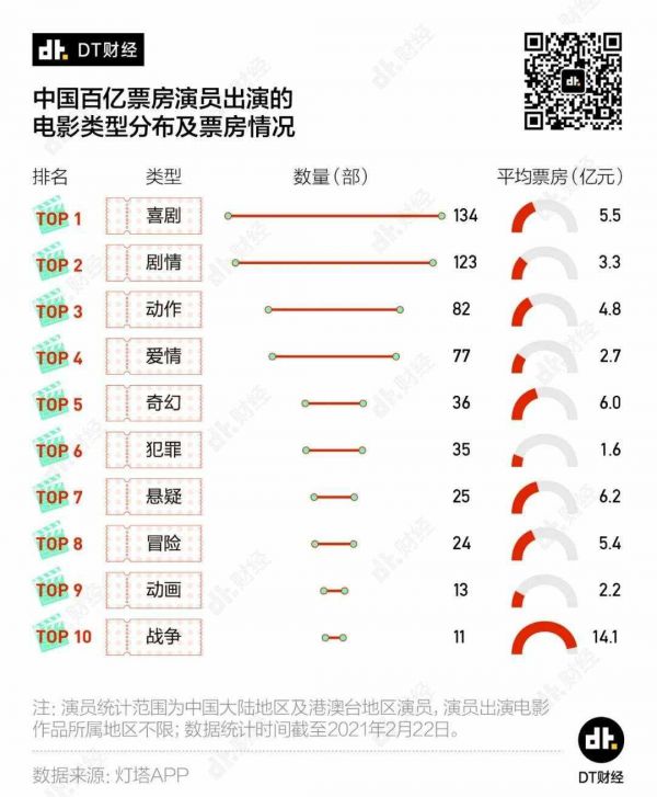 统计了百亿俱乐部中所有演员出演的影片类型,我们发现喜剧电影的数量在所有类型片中一骑绝尘,达到134部,甚至超过了最常见的剧情片。动作片的表现也不错,达到82部,位列第三大类型。