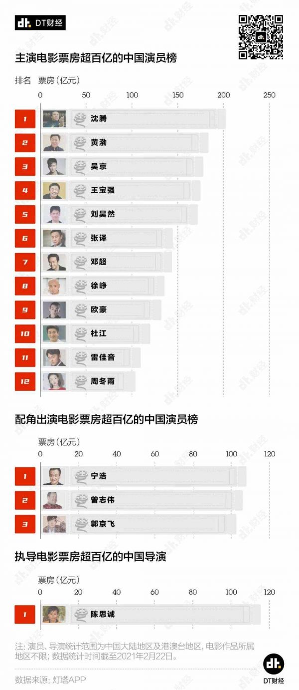 在主演演员组,一共有12名演员入围了百亿俱乐部。在这群票房霸主中,票房成绩又排在前五名的大气层选手依次是沈腾、黄渤、吴京、王宝强和刘昊然。