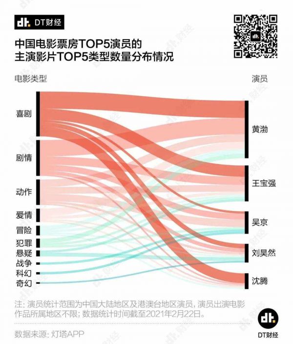 王宝强主演的喜剧片占比超过三成,同时也有相当比例的动作片和爱情片。而五人中最年轻的刘昊然,戏路尚未定型,主演电影类型也相对均衡。