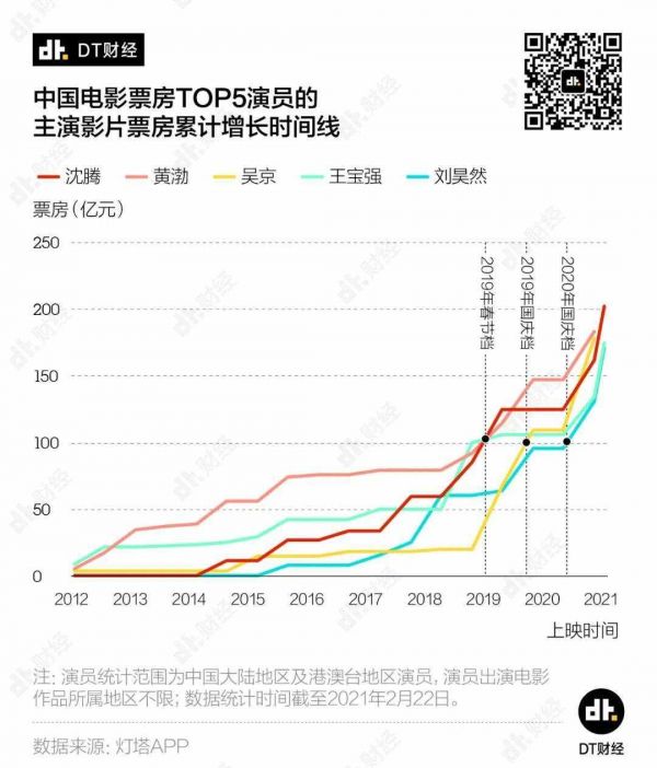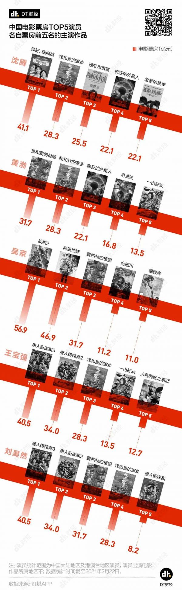看完整体数据,我们再把目光聚焦在百亿俱乐部里的佼佼者、全中国票房最高的五个男人身上。