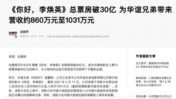 截止2月19日17点,《侍神令》的票房为2.2亿,远远低于万达电影旗下的《唐探3》38亿和华策影视《刺杀小说家》的6.2亿。而《你好,李焕英》的累计票房虽已经超过30亿,但华谊兄弟作为参与投资方,只带来1000万左右营收,可谓杯水车薪。