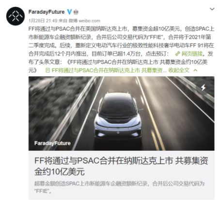 1月28日晚,FF官方微博发布消息称,并购结束后将在纳斯达克上市,股票代码为“FFIE”,募资约10亿美元。