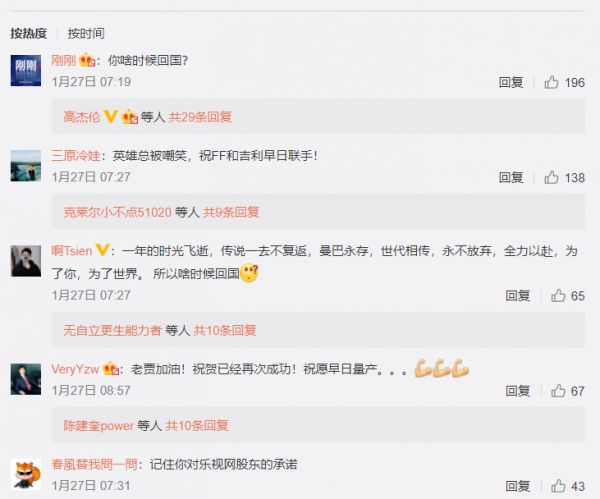 微博下有不少留言,多数都在问老贾“你啥时候回国?”“记住你对乐视网股东的承诺”......