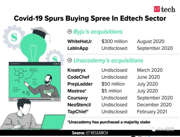 除了Byju's公司的收购,印度另一家独角兽教育公司,Unacademy(最新公开估值20亿美元),外媒称其“已收购TapCheif大部分股权”,按照后者10亿印度卢比(约为1381万美元估值)收购。