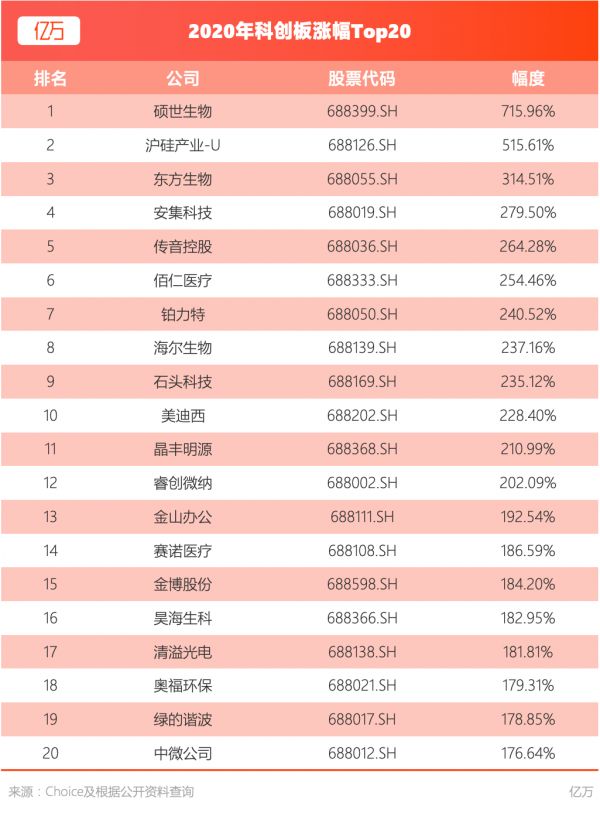 科创板公司普遍存在高涨幅、高市值特点,硕世生物、沪硅产业-U、东方生物分别以涨幅715.96%、515.61%、314.51%领跑全球上市公司,但分化趋势也很明显,硬核科技成为“主战场”。