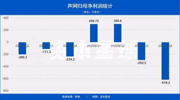 不过除了2020年上半年短暂盈利外,声网一直处于亏损状态,且单季度亏损同比继续保持扩大。其中,2020年第四季度净亏损618.2万美元,同比扩大163.9%。