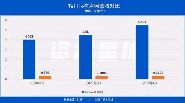 在垂直领域,声网的最大对手是美国上市公司Twilio,2020年Q4Twilio拥有超过22.1万个活跃客户,同期声网的活跃用户只有2095,Twilio在全球影响力及企业主资源方面仍然实力强劲。另Twilio当季营收5.481亿美元,仅从数据来看差不多是声网的16倍。