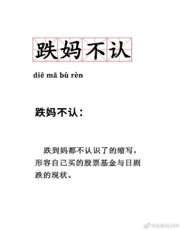 有基民调侃这几天“跌妈不认”——跌到妈都不认识了的缩写,形容自己买的股票基金与日俱跌的现状。