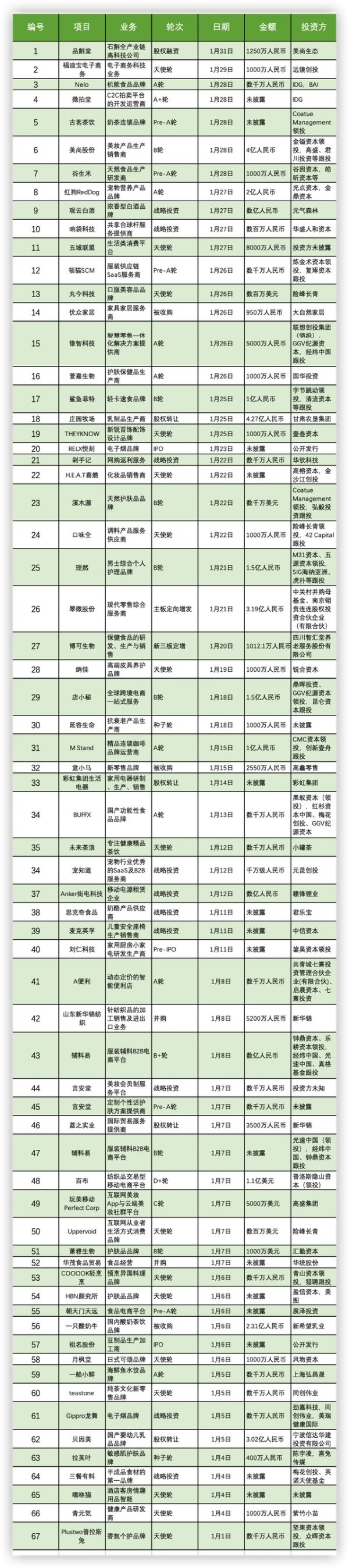 ·1月消费赛道拥有67笔投融资