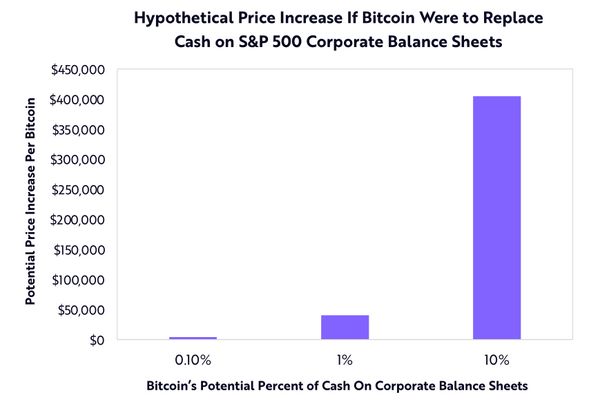 在2021年Big Ideas年度报告中,ARK就提到,如果标普500指数成分股公司都拿出资产负债表里1%的现金来配置比特币,每枚比特币价格将能增加4万美元;若拿出10%,比特币价格则会相应增加40万美元。