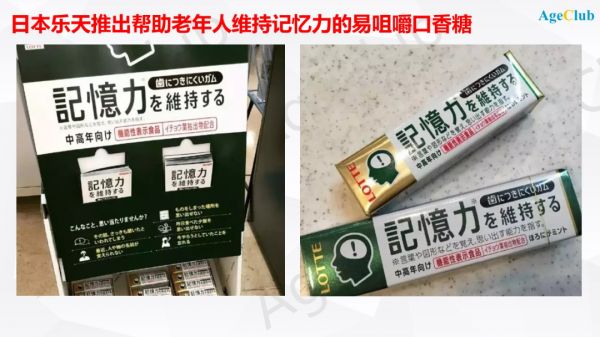 日本乐天就专门为老年人推出了不粘牙口香糖,添加了银杏叶提取物,有助于提高记忆力。该款口香糖易于咀嚼且不粘牙,装有假牙或换牙的人群都可以食用,在老年群体中受到欢迎。