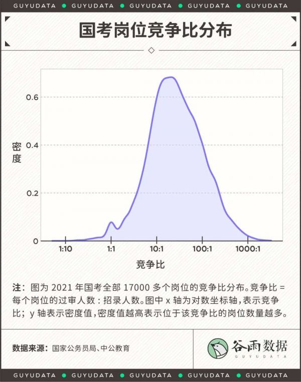 当然,这样的岗位只是少数。我们统计和分析了2021年国考的17000多个岗位信息,发现大多数岗位的竞争比还是集中在10-100之间。