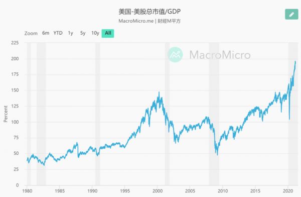 如果按照“巴菲特指标”——美股总市值/GDP来看,那确实已经是历史峰值了。
