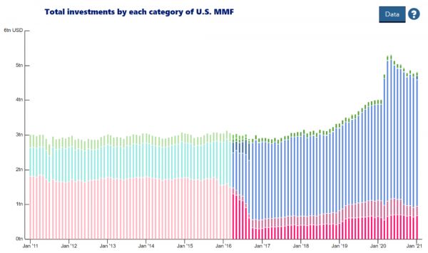 另一个蓄水池是货币基金。SEC报告显示,截止2021年1月,美国货币基金规模是4.8万亿。