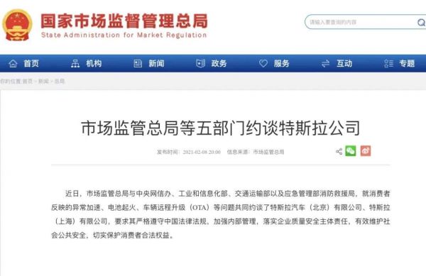 9天后(2月8日),市场监管总局与中央网信办、工业和信息化部、交通运输部以及应急管理部消防救援局,就消费者反映的异常加速、电池起火、车辆远程升级(OTA)等问题共同约谈了特斯拉,要求其严格遵守中国法律法规,加强内部管理,落实企业质量安全主体责任,有效维护社会公共安全,切实保护消费者合法权益。