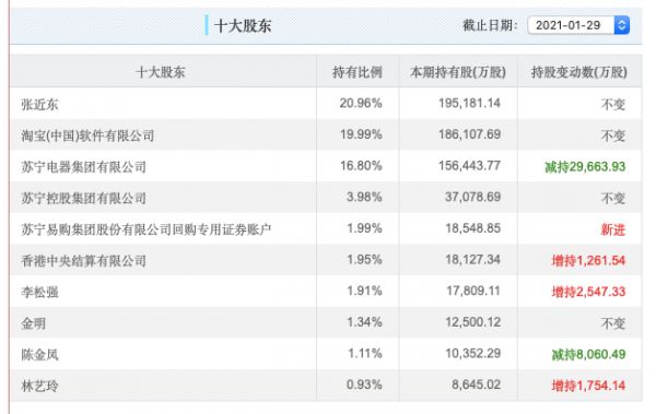 苏宁易购2020年三季报显示,张近东持股20.96%,为公司大股东和实控人;淘宝(中国)软件、苏宁电器集团并列二股东,皆持股19.99%;苏宁控股集团持股3.98%。