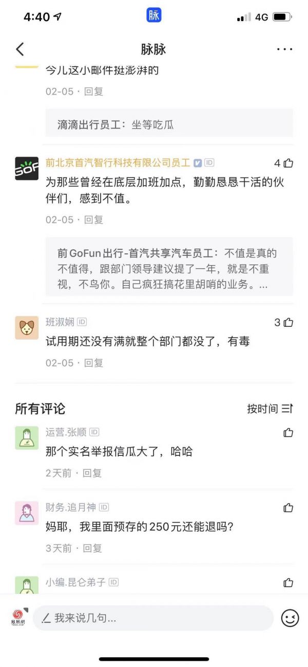 某职场社交软件上同样 GoFun 员工在匿名区爆料此事,有员工评论称,“为那些曾经在底层加班加点,勤勤恳恳干活的伙伴们,感到不值”。 凤凰网科技向 GoFun 方面求证此事,截至发稿未获回应。