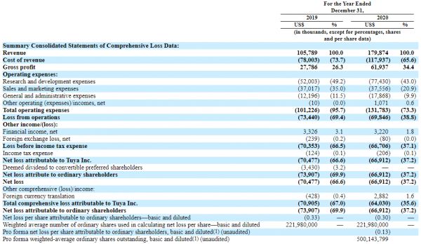 招股书显示,涂鸦智能2020年营收增长至1.799亿美元,与2019年相比增长70%;2019年和2020年涂鸦智能的整体毛利率分别为26.3%和34.4%;其净亏损则从7048万美元小幅收窄至6691万美元。