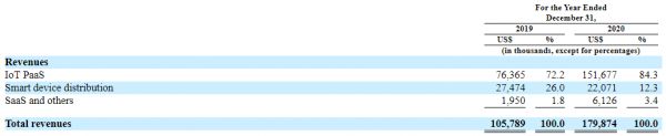 具体来看,涂鸦智能的收入构成主要分为IoT PaaS、智能设备的分销以及SaaS及其他。其中,IoT PaaS产品在2019年和2020年的收入占比分别为72.2%和84.3%,显然撑起了其营收的半壁江山。
