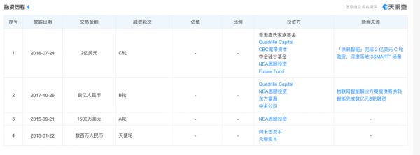 2018年7月,涂鸦智能宣布已完成近2亿美元的C轮融资,投资者由澳大利亚主权财富基金Future Fund,NEA,中金硅谷基金,宽带资本,QuadrilleCapital,香港查氏家族基金(C.M.Capital)等组成。据了解,这是当年IoT领域较为罕见的大规模成功融资案例。