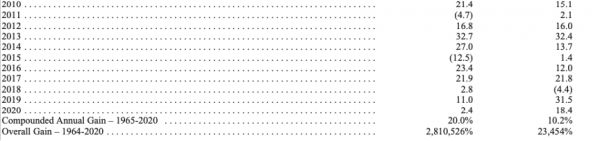年信中显示,2020年,巴菲特的两个目标都未能实现:伯克希尔没有进行大规模收购,营业利润也下降了9%。公司斥资247亿美元进行回购以提升每股内在价值。但如果长线来看,1965-2020年间,伯克希尔每股市值的复合年增长率为20.0%,超过标普500指数的10.2%。而1964-2020年伯克希尔的市值增长率是令人吃惊的2.8万倍,远高于同期标普500仅有234倍的涨幅。