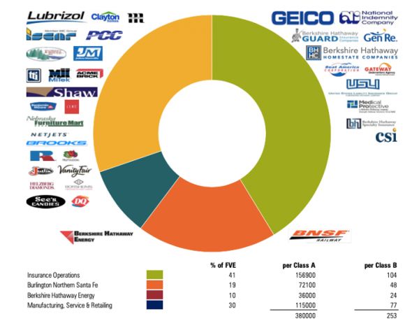 伯克希尔旗下的四大业务板块包括保险、能源、铁路和制造、服务、零售业等。(来源:晨星研报)