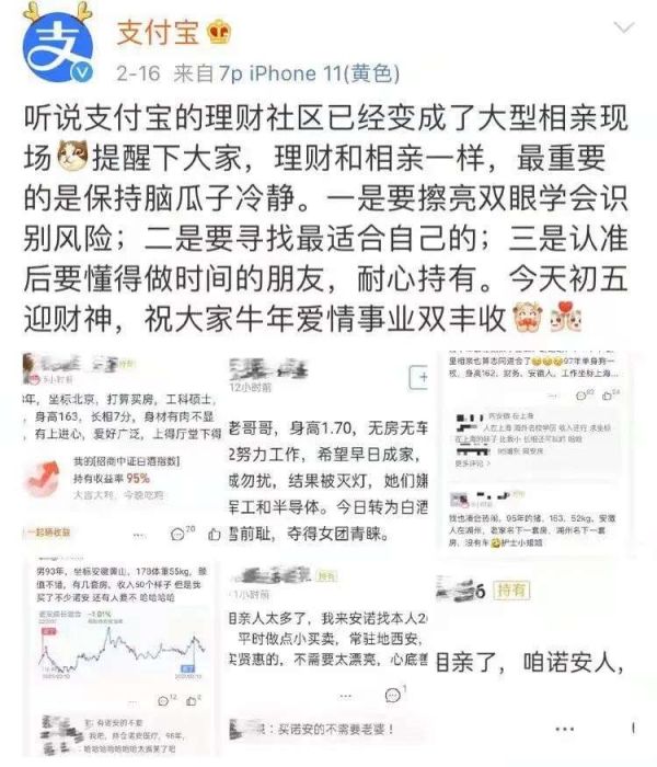 在刚刚过去的春节期间,支付宝等App的基金讨论区涌入了大量的“相亲”留言贴。基金休市、假期空闲,不少年轻人纷纷在讨论区晒出自身条件、收益情况,寻找有缘人。