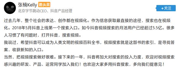 今年年初,张楠喊话道,“接下来的一年,抖音将加大对搜索的投入力度,欢迎对视频搜索感兴趣的研发、产品、运营同学加入我们。”