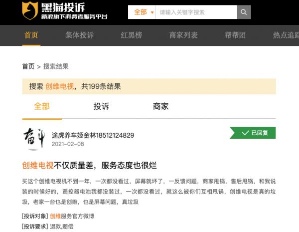 在新浪财经近期的卖场走访中,有导购坦言,OLED因性价比、烧屏、辐射大以及耗损高等问题,消费者接受度并不高。在黑猫投诉中,关于创维电视投诉约两百条,主要问题集中在电视机黑屏、光斑以及售后维修费较高等方面。