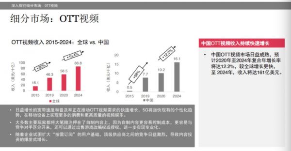 事实上,酷开涉足的OTT市场也并非什么蓝海,竞争压力并不比彩电小。普华永道《2020-2024年全球娱乐及媒体行业展望》预计,中国娱乐及媒体行业5年的总收入复合年增长率为5.2%,比全球平均数据高出0.1个点。其中,OTT将是增长较快的细分市场。