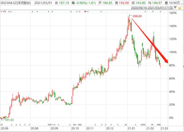 (洋河股价走势图,来源:Wind)