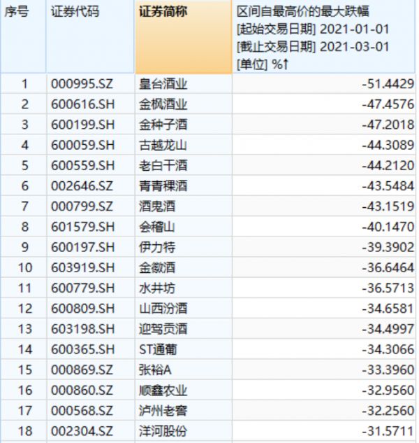 (白酒跌幅统计表,来源:Wind)