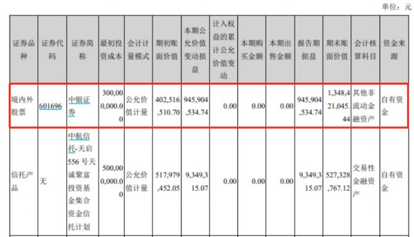 根据去年一季报披露,洋河持有中银证券3.16%的股份,持股份额为7894.7万股,该笔原始投入资金为3亿元,2020年初账面价值为4.03亿元。
