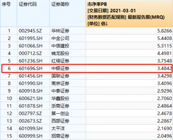 (券商最新PB统计,来源:Wind)