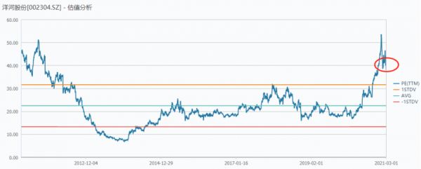 当前,洋河动态PE为37.73倍,处于最近10年估值高位水平。很显然,在去年主营业务有所恶化的情况,股价还一度被暴拉200%以上,大多源于市场资金大幅猛炒白酒板块。而业绩没有跟上去,估值就得回撤。最近股价大幅暴跌,就是例证。