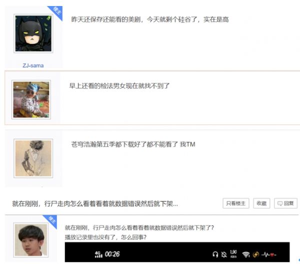 还有网友表示,“《行尸走肉》看着就数据错误然后就下架了”、“《苍穹浩瀚》第五季都下载好了都不能看了”。读娱君在APP中搜索《行尸走肉》,结果显示了来自优酷的外部播放源,搜索《苍穹浩瀚》则是没有了搜索结果条目。