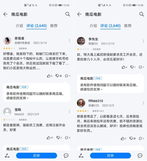 其次,在南瓜电影APP的华为应用市场页面,评论区里有不少用户写道“强制员工消费”、“门口保安拦下来让我报手机冲会员,小区是恒大物业”、“恒大海上威尼斯强制要求员工开会员,还要拉够几十人开”……百度贴吧同样有网友发布类似信息。