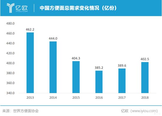 世界方便面协会(WINA)的数据显示,从2013~2017年,中国市场的方便面需求从462.2亿份下滑至389.7亿份,累计下滑了约15.7%。