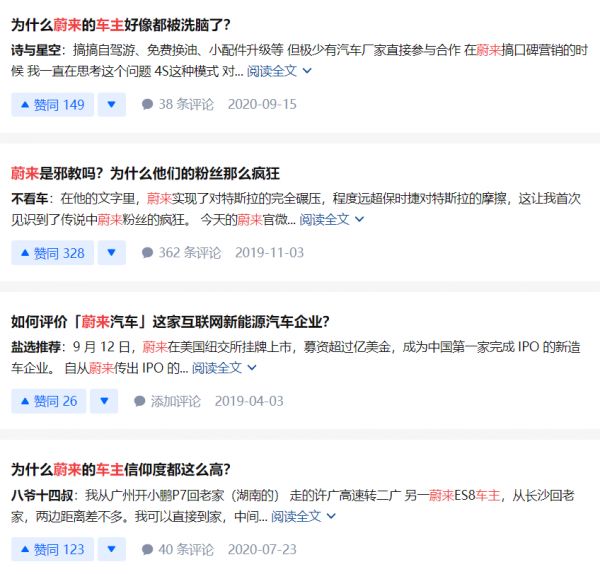 值得注意的是,对于蔚来车主这一群体的争议从未间断,以至于在知乎上有提问“为什么蔚来的车主好像都被洗脑了”。