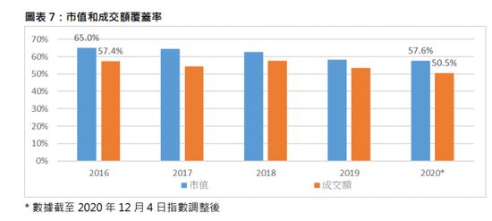 根据统计,恒生指数成份股截至2020年12月对整体市场的市值覆盖率已经降至57.6%,成交量覆盖率甚至降到50.5%。