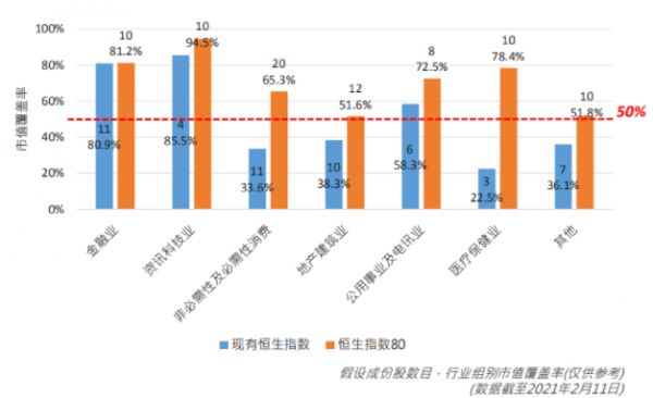 现在,恒生指数成份股将从七个行业组别选出,目标是使每个行业组别的市值覆盖率不低于50%。这样也需会牺牲个别大市值公司,但可以使得恒指的行业覆盖程度更加均衡。