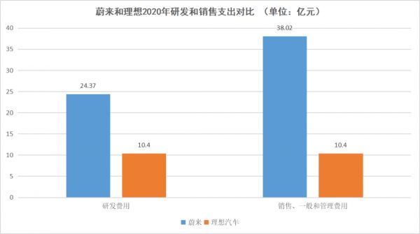 蔚来和理想2020年研发和销售支出对比,数据来源于公开财报,连线出行制图