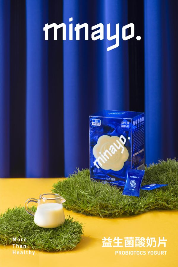 不易坚持是功能性食品最大的消费痛点。团队以更加零食化、便携化的方式去降低食用门槛,将“好吃”作为在“安全”、“有效”之后的第三个基本法则。以功能零食线的新品「益生菌酸奶片」为例,minayo将活性益生菌以冻干状态与酸奶粉结合在一起,既保证了成分活性,也成就了口感。