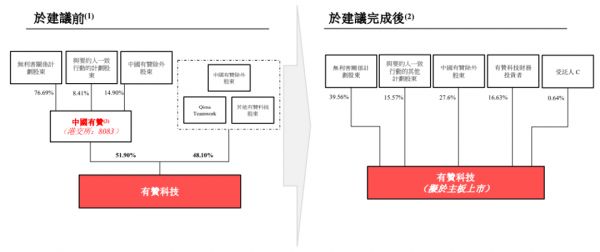 本次给出的方案表示,中国有赞股东均有权根据分派就每股中国有赞股份收取0.05077265股有赞科技股份,并收到现金0.1352港元,每股理论总值相当于2.3088港元。这一价值比公告发布前最后交易日折价30.2%。