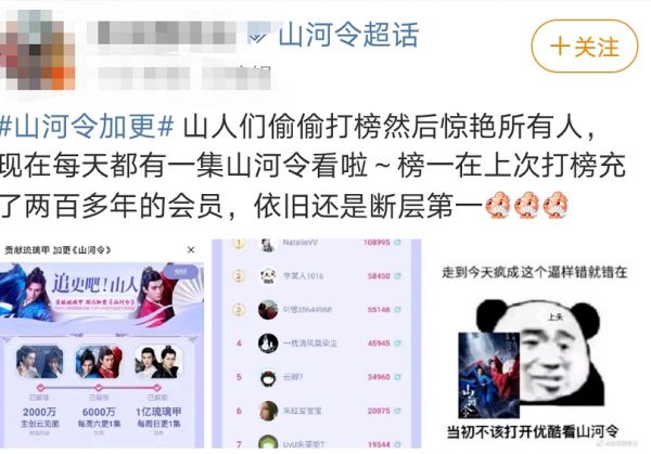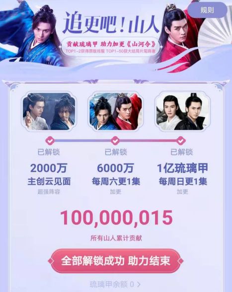 此次《山河令》的火爆为这方面动态增加了新的事例。面对网友们的催更声浪,优酷解锁新玩法“加更打投”。剧迷可以通过邀请好友助力、观看视频和充会员等方式获得打投道具“琉璃甲”,积累满2000万琉璃甲可解锁主创云见面会,满6000万琉璃甲每周六更新一集,集满1亿琉璃甲则每周日再更新一集。