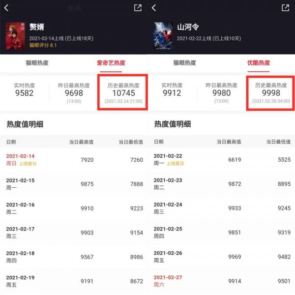 《赘婿》于2月14日在爱奇艺首播,根据猫眼专业版上线后一周爱奇艺热度已破万,成为2018年《延禧攻略》之后最快破万的一部作品;《山河令》则在2月22日开播后迅速走红,登顶优酷剧集热度榜TOP1,站内热度达9998,且在豆瓣上被12万网友打出8.4分。